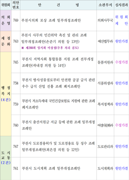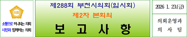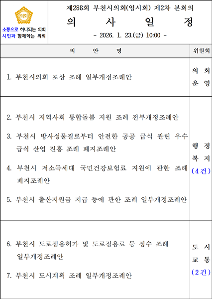 ºÎõ½ÃÀÇȸ(ÀÇÀå ±èº´Àü)´Â 23ÀÏ, Á¦288ȸ ÀÓ½Ãȸ Á¦2Â÷ º»È¸ÀǸ¦ ¿­¾î »óÁ¤µÈ ¾È°ÇÀ» ó¸®Çϰí 9Àϰ£ÀÇ ÀÏÁ¤À» ¸ðµÎ ¸¶¹«¸®Çß´Ù.