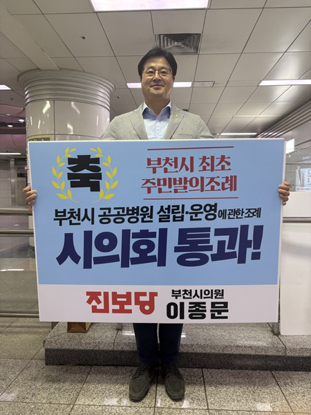 ºÎõ½ÃÀÇȸ ÀÌÁ¾¹® ÀÇ¿ø(Áøº¸´ç , ¸¶¼±°Å±¸ )ÀÌ 30ÀÏ ¿ÀÀü , ½ÅÁßµ¿¿ª¿¡¼ ¡®ºÎõ½Ã °ø°øÀÇ·á¿ø ¼³¸³ ¡¤¿î¿µ¿¡ °üÇÑ Á¶·Ê (ÀÌÇÏ °ø°øÀÇ·á¿øÁ¶·Ê )¡¯ Åë°ú¸¦ ȯ¿µÇÏ´Â Ä·ÆäÀÎÀ» ÁøÇàÇß´Ù . ÇØ´ç Á¶·Ê´Â ºÎõ½Ã¹Î 8,300¿©¸íÀÇ ÁÖ¹Îû±¸Á¶·Ê¾ÈÀ¸·Î ºÎõ½ÃÀÇȸ¿¡ Á¦ÃâµÇ¾î Áö³ 29ÀÏ º»È¸ÀÇ¿¡¼ °¡°áµÇ¾ú´Ù . ºÎõ½Ã ÃÖÃÊ , °æ±âµµ¿¡¼´Â ¼º³²¿¡ ÀÌ¾î µÎ ¹øÂ° °ø°øÀÇ·á¿øÁ¶·Ê°¡ Åë°úµÈ °ÍÀÌ´Ù .