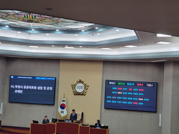 Áö³­ 4¿ù 22ÀÏ Á¦ 283ȸ ÀÓ½Ãȸ¸¦ ½ÃÀÛÇÑ ºÎõ½ÃÀÇȸ°¡ 4¿ù 29ÀÏ ¿­¸° º»È¸ÀÇ¿¡¼­ ÀçÀû ÀÇ¿ø 27¸í Áß 26¸í Àç¼®, Âù¼º 20¸í, ¹Ý´ë 4¸í, ±â±Ç 2¸íÀ¸·Î <ºÎõ½Ã °ø°øÀÇ·á¿ø¼³¸³ ¹× ¿î¿µ Á¶·Ê¾È>À» ÃÖÁ¾ °¡°áÇß´Ù. ÇØ´ç Á¶·Ê¾ÈÀº Áö³­ 4¿ù 23ÀÏ ÇàÁ¤º¹ÁöÀ§¿øÈ¸ÀÇ ½ÉÀǸ¦ °ÅÃÄ ÀϺΠ¼öÁ¤µÈ ¾ÈÀ¸·Î¼­, 2021³â 10¿ù 19ÀÏ Á¦Á¤µÈ ¡¸ÁÖ¹ÎÁ¶·Ê¹ß¾È¿¡ °üÇÑ ¹ý·ü¡¹ÀÌ 2022³â 1¿ù 13ÀÏ ½ÃÇàµÈ ÀÌ·¡ û±¸¿ä°ÇÀ» °®Ãç ¹ßÀÇ, °¡°áµÈ ºÎõ½Ã ÃÖÃÊÀÇ ÁֹιßÀÇÁ¶·ÊÀÌÀÚ Àü±¹ µÎ ¹øÂ° °ø°øÀÇ·á¿ø ¼³¸³ ÁֹιßÀÇÁ¶·ÊÀÌ´Ù.