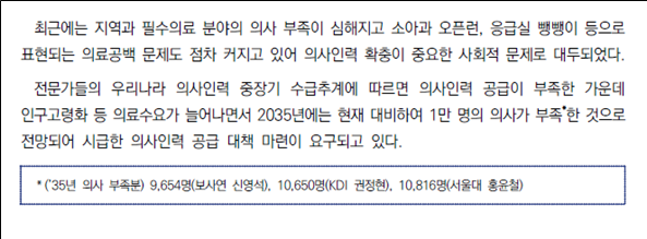¹é¼¿¡´Â Çѱ¹º¸°Ç»çȸ¿¬±¸¿ø ½Å¿µ¼® ¹Ú»ç(2035³â 9,654¸í ºÎÁ·), KDI ±ÇÁ¤Çö ¹Ú»ç(1¸¸650¸í ºÎÁ·), ¼¿ï´ë ÀÇ´ë È«À±Ã¶ ±³¼ö(1¸¸816¸í ºÎÁ·)ÀÇ ¿¬±¸¸¦ ÀοëÇØ 2035³â ÃÖ´ë 1¸¸ ¸íÀÇ ÀÇ»ç ºÎÁ·À» Àü¸ÁÇϸç Áõ¿øÀÇ ºÒ°¡ÇǼºÀ» °Á¶Çß´Ù. ¶ÇÇÑ ÀÇ·á°è¿Í ÇùÀÇü 27ȸ, Á¤Ã¥½ÉÀÇÀ§ Àü¹®À§¿øÈ¸ 19ȸ ³íÀǸ¦ °ÅÃÆ´Ù°í ¼³¸íÇϸç ÃæºÐÇÑ »çȸÀû ³íÀǰ¡ ÀÌ·ïÁ³À½À» ¹àÇû´Ù. ¹Ý¸é ÀÇ´ë»ý Áý´Ü ÈÞÇÐ, Àü°øÀÇ Áý´Ü »çÁ÷, ÀÇ·á°ø¹é°ú ºñ»óÁø·áü°è °¡µ¿ µî ±¹¹Î ºÒÆíÀº ¾ð±ÞÇÏÁö ¾Ê¾Ò´Ù.