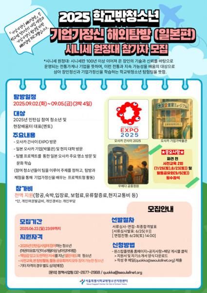 ¼¿ïƯº°½ÃÇб³¹Ûû¼Ò³âÁö¿ø¼¾ÅÍ(ÀÌÇÏ ¼¾ÅÍ)´Â ¡®2025 ¿À»çÄ«¡¤°£»çÀÌ EXPO¡¯ Âü°ü°ú ±Û·Î¹ú ±â¾÷ ޹æÀ» ¿¬°èÇÑ ¡®2025 ±â¾÷°¡Á¤½Å ÇØ¿Ü޹æ(ÀϺ»Æí)¡¯ Âü°¡ÀÚ¸¦ ¸ðÁýÇÑ´Ù°í ¹àÇû´Ù.