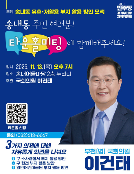 À̰ÇÅ ±¹È¸ÀÇ¿ø(°æ±â ºÎõº´, ´õºÒ¾î¹ÎÁÖ´ç)ÀÌ ¿À´Â 13ÀÏ(¸ñ) ¿ÀÈÄ 7½Ã, ¼Û³»¾î¿ï¸¶´ç¿¡¼­ ¡®¼Û³»µ¿ ±Ç¿ª À¯ÈÞ¡¤ÀúȰ¿ë ºÎÁö Ȱ¿ë ¹æ¾È ¸ð»ö¡¯À» ÁÖÁ¦·Î ¡®¼Û³»µ¿ Ÿ¿îȦ¹ÌÆÃ¡¯À» °³ÃÖÇÑ´Ù.