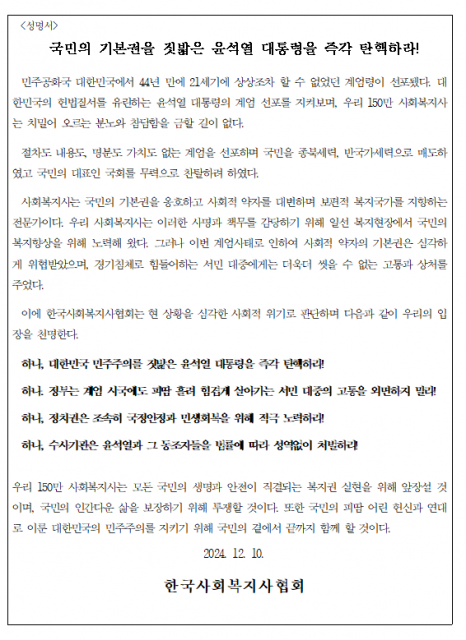 Çѱ¹»çȸº¹Áö»çÇùȸ°¡ À±¼®¿­ ´ëÅë·ÉÀÇ ÅºÇÙÀ» Ã˱¸ÇÏ´Â ¼º¸í¼­¸¦ ¹ßÇ¥Çß´Ù.