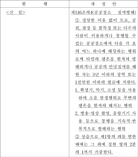 À̹ø °³Á¤¾ÈÀº ¡¸Çü¹ý¡¹¿¡ ¡®°ø°øÀå¼Ò Áú¼­¹æÇØÁË(Á¦116Á¶ÀÇ4)¡¯¸¦ ½Å¼³ÇÏ¿©, Á¤´çÇÑ ÀÌÀ¯ ¾øÀÌ µµ·Î¡¤°ø¿ø¡¤±¤Àå µî ºÒÆ¯Á¤ ´Ù¼ö°¡ ÀÌ¿ëÇÏ´Â °ø°øÀå¼Ò¿¡¼­ ¡ãÈ®¼º±â¡¤¾Ç±â¡¤°í¼º µîÀ¸·Î ¼ÒÀ½À» ¹ß»ý½ÃŰ°Å³ª ¡ã¹æ¼Û¡¤¿µ»ó ÃÔ¿µ¡¤À½Çâ±â±â »ç¿ë µîÀ¸·Î ÅëÇàÀ» Áö¼ÓÀû¡¤¹Ýº¹ÀûÀ¸·Î ¹æÇØÇØ Å¸ÀÎÀÇ Æò¿ÂÀ» ÇöÀúÈ÷ ÇØÄ¡´Â ÇàÀ§¸¦ 3³â ÀÌÇÏÀÇ Â¡¿ª ¶Ç´Â 1õ¸¸ ¿ø ÀÌÇÏÀÇ ¹ú±Ý¿¡ óÇϵµ·Ï ±ÔÁ¤Çß´Ù. ¶ÇÇÑ, »ó½ÀÀûÀ¸·Î ¹üÇÑ °æ¿ì¿¡´Â ÇüÀÇ 2ºÐÀÇ 1±îÁö °¡Áßó¹ú ÇÒ ¼ö ÀÖµµ·Ï ±ÔÁ¤Çß´Ù.