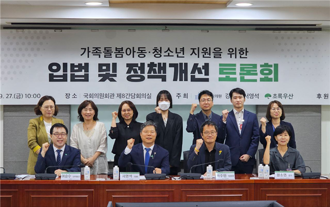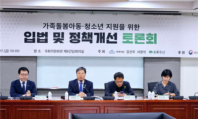 ¾Æµ¿º¹ÁöÀü¹®±â°ü ÃÊ·Ï¿ì»ê(ȸÀå Ȳ¿µ±â)°ú ±¹È¸ º¸°Çº¹ÁöÀ§¿øÈ¸ ¼Ò¼Ó ´õºÒ¾î¹ÎÁÖ´ç °­¼±¿ì(¼­¿ï °­¼­±¸°©)¤ý¼­¿µ¼®(°æ±â ºÎõ½Ã°©) ÀÇ¿øÀÌ 27ÀÏ(±Ý) ±¹È¸ÀÇ¿øÈ¸°ü Á¦8°£´ãȸÀǽǿ¡¼­ °øµ¿À¸·Î ÁÖÃÖÇÑ ¡¸°¡Á·µ¹º½¾Æµ¿¤ýû¼Ò³â Áö¿øÀ» À§ÇÑ ÀÔ¹ý ¹× Á¤Ã¥°³¼± Åä·Ðȸ¡¹°¡ ¼ºÈ²¸®¿¡ Á¾·áµÆ´Ù. À̹ø Á¤Ã¥Åä·Ðȸ´Â °¡Á·µ¹º½¾Æµ¿¤ýû¼Ò³â¿¡ ´ëÇÑ ÃÊ·Ï¿ì»êÀÇ ¿¬±¸Á¶»ç °á°ú¸¦ Åä´ë·Î À̵鿡 ´ëÇÑ Áö¿øÃ¼°è¸¦ ³íÀÇÇϱâ À§ÇØ ¸¶·ÃµÆ´Ù.