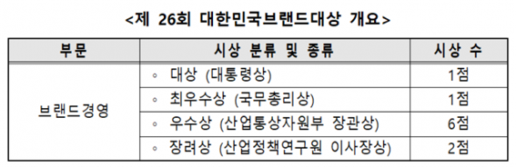 »ê¾÷Åë»óÀÚ¿øºÎ(Àå°ü ¾È´ö±Ù) ÁÖÃÖ, »ê¾÷Á¤Ã¥¿¬±¸¿ø(ÀÌ»çÀå Á¶µ¿¼º) ÁÖ°üÀÇ ¡®Á¦26ȸ ´ëÇѹα¹ºê·£µå´ë»ó¡¯ÀÌ Á¤ºÎ ½Ã»ó(´ëÅë·É»ó, ±¹¹«ÃѸ®»ó, »ê¾÷Åë»óÀÚ¿øºÎ Àå°ü»ó µî 10Á¡)¿¡ ´ëÇÑ ½Åû Á¢¼ö¸¦ ¹Þ°í ÀÖ´Ù.