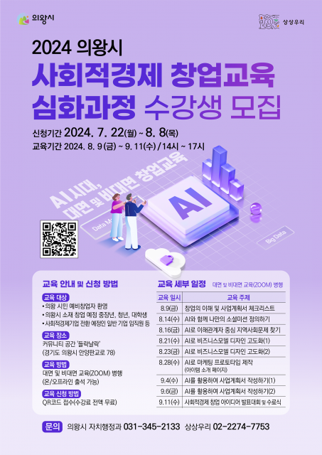 ±³À°Àº 8¿ù 9ÀÏ ¿ÀÈÄ 2½ÃºÎÅÍ ÀÇ¿Õ Ä¿¹Â´ÏƼ °ø°£ ¡®µé¶ô³¯¶ô¡¯¿¡¼­ °³ÃֵǸç, È¿À²ÀûÀÎ ÇнÀÀ» À§ÇØ ´ë¸é ¹× ºñ´ë¸é ±³À°À» º´ÇàÇØ ¿Â¶óÀÎ(ÁÜ)À» ÅëÇØ¼­µµ ¼ö°­ÇÒ ¼ö ÀÖ´Ù. ¼ö°­½ÅûÀº 8¿ù 8ÀϱîÁö È«º¸ Æ÷½ºÅÍÀÇ QRÄÚµå ½ºÄµÀ» ÅëÇØ °¡´ÉÇÏ´Ù.