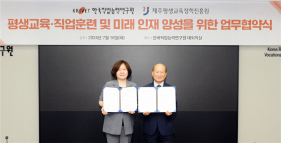 °íÇý¿ø Çѱ¹Á÷¾÷´É·Â¿¬±¸¿ø ¿øÀå(¿ÞÂÊ)°ú °í½ÂÇÑ Á¦ÁÖÆò»ý±³À°ÀåÇÐÁøÈï¿ø ¿øÀåÀº 16ÀÏ ¼¼Á¾±¹Ã¥¿¬±¸´ÜÁö û»ç¿¡¼­ Æò»ý±³À°¡¤Á÷¾÷ÈÆ·Ã ¹× ¹Ì·¡ÀÎÀç ¾ç¼ºÀ» À§ÇÑ ¾÷¹«Çù¾àÀ» ü°áÇß´Ù
