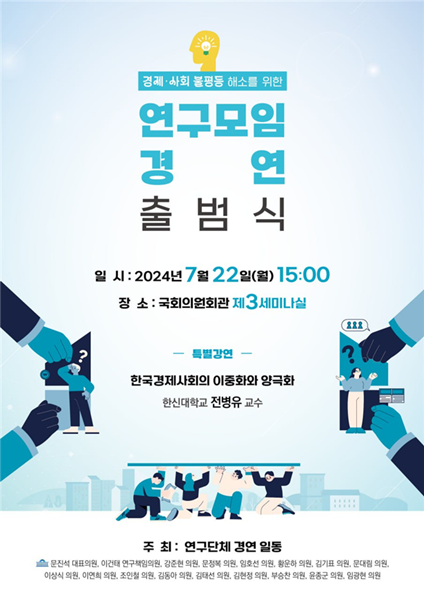 ±¹È¸ÀÇ¿ø ¿¬±¸¸ðÀÓ ¡®°æ¿¬(°æÁ¦¡¤»çȸ ºÒÆòµî ÇØ¼Ò¸¦ À§ÇÑ ¿¬±¸¸ðÀÓ)¡¯Àº ¿À´Â 22ÀÏ(¿ù) ¿ÀÈÄ 3½Ã¿¡ ±¹È¸ÀÇ¿øÈ¸°ü Á¦3¼¼¹Ì³ª½Ç¿¡¼­ Ãâ¹ü½ÄÀ» ¿±´Ï´Ù.