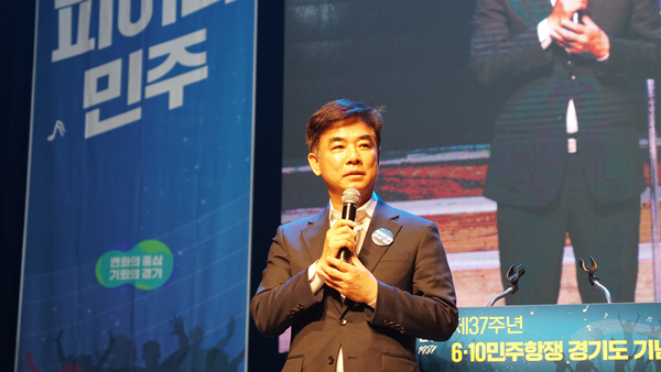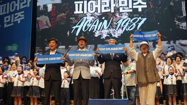 Á¦ 37ÁÖ³â 6.10 ¹ÎÁÖÇ×Àï °æ±âµµ ±â³ä½Ä¿¡ Âü¼®ÇÏ¿© ¡®ÇǾî¶ó ¹ÎÁÖ AGAIN 1987¡¯ÇÇÄÏÀ» µé°í ÀÖ´Ù.