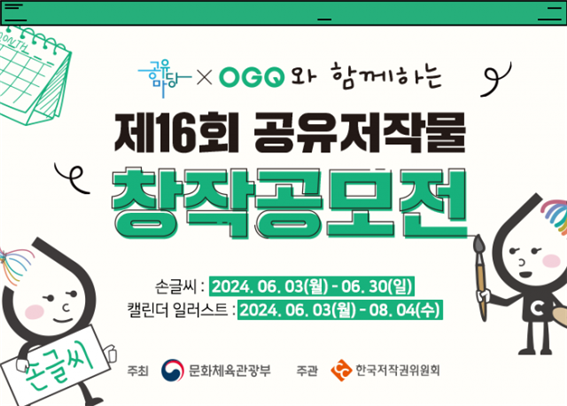 ¼­¿ï--(´º½º¿ÍÀ̾î)--Å©¸®¿¡ÀÌÅ͸¦ À§ÇÑ Ä¿¹Â´ÏƼ OGQ ±×¶óÆú¸®¿À°¡ ¹®È­Ã¼À°°ü±¤ºÎ(Àå°ü À¯ÀÎÃÌ) ¹× Çѱ¹ÀúÀÛ±ÇÀ§¿øÈ¸(À§¿øÀå Á÷¹«´ëÇà ÀÌ´ëÈñ)¿Í ÇÔ²² ¡®Á¦16ȸ °øÀ¯ÀúÀÛ¹° âÀÛ°ø¸ðÀü¡¯À» ¿À´Â 6¿ù 3ÀϺÎÅÍ °³ÃÖÇÑ´Ù.