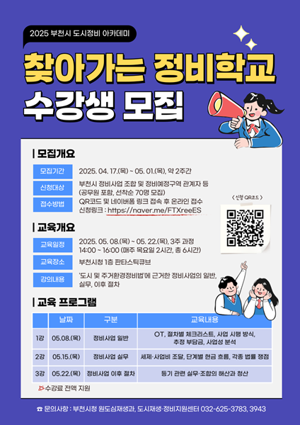 ºÎõ½Ã´Â ¿À´Â 4¿ù 17ÀϺÎÅÍ 5¿ù 1ÀϱîÁö Á¤ºñ¿¹Á¤±¸¿ª ¹× »ç¾÷ÃßÁø ÁßÀÎ Á¶ÇÕ °ü°èÀÚ µîÀ» ´ë»óÀ¸·Î ºÎõ½Ã µµ½ÃÁ¤ºñ ¾ÆÄ«µ¥¹Ì ¡®Ã£¾Æ°¡´Â Á¤ºñÇб³¡¯ ¼ö°»ýÀ» ¸ðÁýÇÑ´Ù.