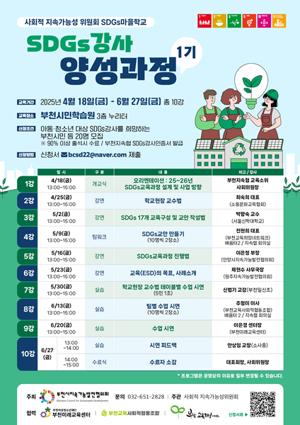 ºÎõ½ÃÁö¼Ó°¡´É¹ßÀüÇùÀÇȸ(´ëǥȸÀå Çã¿ø¹è)´Â ¿À´Â 4¿ù 18ÀÏ(±Ý)ºÎÅÍ 6¿ù 27ÀÏ(±Ý)±îÁö 10°¿¡ °ÉÃÄ ¡¸SDGs°»ç ¾ç¼º°úÁ¤¡¹À» ¿î¿µÇÑ´Ù. ¾ç¼º°úÁ¤Àº ¾Æµ¿¡¤Ã»¼Ò³â¿¡°Ô ÇöÀå¿¡¼ Áö¼Ó°¡´É¹ßÀü±³À°(ESD) °ÀǸ¦ ÁøÇàÇÒ ¼ö ÀÖ´Â ½Ã¹Î°ú Ȱµ¿°¡¸¦ ´ë»óÀ¸·Î ¼ö°ÀÚ¸¦ ¼±¹ßÇÏ¿© ¸ðÁýÇÑ´Ù.