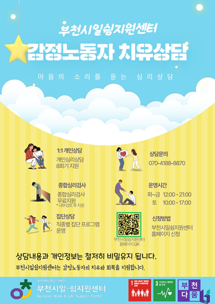 ¡à ºÎõ¿©¼ºÃ»¼Ò³âÀç´ÜÀÌ ¿î¿µÇÏ´Â ºÎõ½ÃÀϽ°Áö¿ø¼¾ÅÍ Ä¡À¯»ó´ã½ÇÀº °¨Á¤³ëµ¿ÀÚ¿¡°Ô Àü¹®°¡ °³Àλó´ã°ú Á¾Çսɸ®°Ë»ç µîÀ» Áö¿øÇϰí ÀÖ´Ù.