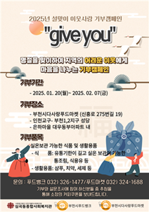 ºÎõ½Ã ½É°îµ¿Á¾ÇÕ»çȸº¹Áö°ü(°üÀå ¿¬Á¤ÁØ)¿¡¼­ ¿î¿µÇÏ´Â ºÎõ½ÃǪµå¹ðÅ©¿¡¼­´Â ¹ÎÁ·ÀÇ ´ë¸íÀýÀÎ ¼³À» ¸Â¾Æ 2025³â 1¿ù 20ÀÏ(¿ù)ºÎÅÍ 2¿ù 7ÀÏ(±Ý)±îÁö 3ÁÖ°£ ÀÌ¿ô»ç¶û ±âºÎÄ·ÆäÀÎ ¡°give you¡±(±âºêÀ¯)¸¦ ÁøÇàÇÑ´Ù°í ¹àÇû´Ù.