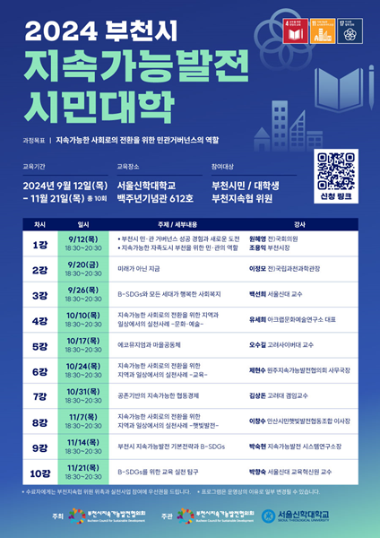 ½Ã¹Î´ëÇÐÀº ºÎõ½Ã Áö¼Ó°¡´É¹ßÀü¸ñÇ¥(B-SDGs)¿¡ ´ëÇÑ ÀÌÇØ¿Í Áö¼Ó°¡´ÉÇÑ »çȸ·ÎÀÇ ÀüȯÀ» À§ÇÑ ½Çõ»ç·Ê, ¹Î¡¤°ü°Å¹ö³Í½ºÀÇ ¿ªÇÒ µî ºÎõÁö¼ÓÇù Ȱµ¿¿¡ ÇÊ¿äÇÑ Á÷¹«±³À° ¼º°ÝÀ¸·Î ±¸¼ºµÇ¾î ¿î¿µµÈ´Ù. ºÎºÐ ¼ö°µµ °¡´ÉÇϳª Àüü¼ö° ½ÅûÀÚ¸¦ ¿ì¼± ¼±¹ßÇÒ ¿¹Á¤ÀÌ´Ù. ÀÚ¼¼ÇÑ ±³À°³»¿ëÀº À¥Æ÷½ºÅÍ ±³À°°úÁ¤À» Âü°íÇÏ¸é µÈ´Ù.