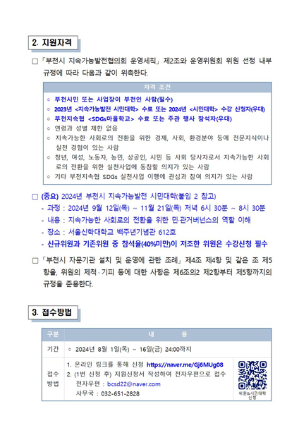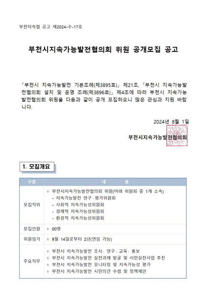 ºÎõ½ÃÁö¼Ó°¡´É¹ßÀüÇùÀÇȸ(´ëǥȸÀå Çã¿ø¹è, ÀÌÇÏ ºÎõÁö¼ÓÇù)´Â ºÎõ½Ã Áö¼Ó°¡´É¹ßÀü ±âº»Á¶·Ê¿Í ÇùÀÇȸ ¼³Ä¡ ¹× ¿î¿µ Á¶·Ê¿¡ ±Ù°ÅÇØ ¿À´Â 8¿ù 1ÀϺÎÅÍ 16ÀϱîÁö »êÇÏ 4°³ À§¿øÈ¸ À§¿øÀ» °ø°³ ¸ðÁýÇÑ´Ù.