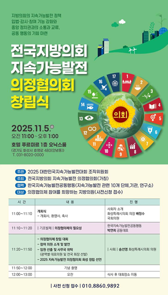 2025³â 11¿ù 5ÀÏ, È­¼ºÆ¯·Ê½Ã¿¡¼­ ¿­¸° 2025 ´ëÇѹα¹Áö¼Ó°¡´É¹ßÀü´ëȸ¿¡¼­ Àü±¹ ±âÃÊ¡¤±¤¿ª Áö¹æÀÇ¿øµéÀÌ Âü¿©ÇÏ´Â Àü±¹Áö¹æÀÇȸ Áö¼Ó°¡´É¹ßÀü ÀÇÁ¤ÇùÀÇȸ°¡ °ø½Ä Ãâ¹üÇß´Ù.
