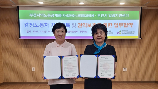 ¡à ºÎõ¿©¼ºÃ»¼Ò³âÀç´ÜÀÌ ¿î¿µÇÏ´Â ºÎõ½Ã ÀϽ°Áö¿ø¼¾ÅÍ(¼¾ÅÍÀå ±è¼öÁ¤)´Â ºÎõÁö¿ª³ëµ¿°øÁ¦È¸(»ç)ÀÏÇϴ»ç¶÷µé°úÇÔ²²(°øµ¿´ëÇ¥ ½ÉÁö¼±, ÀÌ¿Á¼ø, ÃÖ¿µÁø, ÀÌÇÏ ¡®³ëµ¿°øÁ¦È¸¡¯)¿Í °¨Á¤³ëµ¿ÀÚ Ä¡À¯¡¤È¸º¹ ¹× ±ÇÀÍ º¸È£¸¦ À§ÇØ »óÈ£ Çù·ÂÇϱâ À§ÇÑ ¾÷¹«Çù¾àÀ» ü°áÇß´Ù°í 4ÀÏ ¹àÇû´Ù.